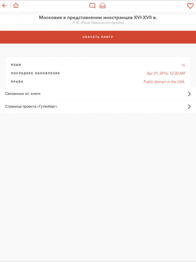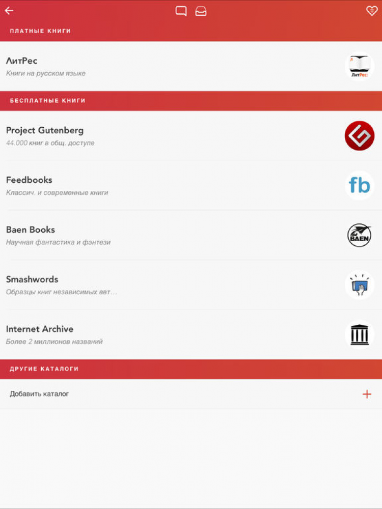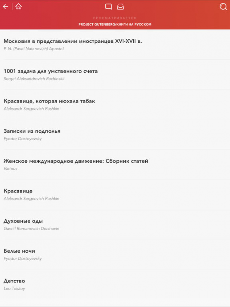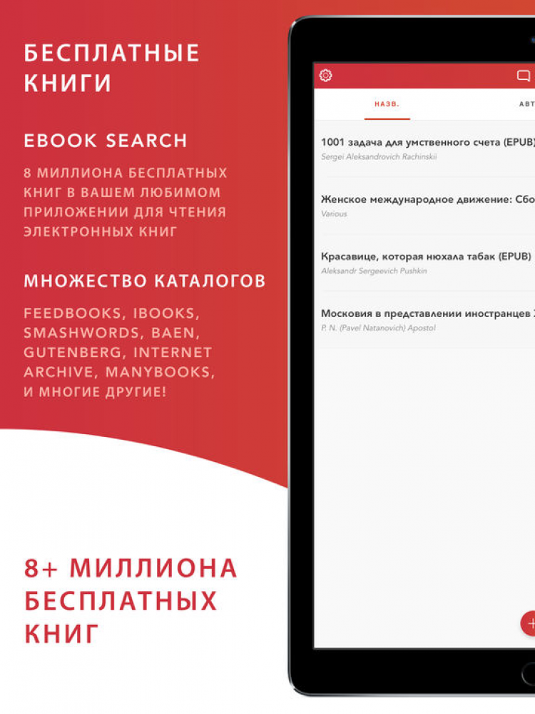 Любые произведения на ваш выбор, нужно только открыть каталог (с помощью eBook Search) и выбрать книгу. Два касания экрана и вы видите выбранную книгу в своей любимой «читалке» — Kindle, Nook, iBooks и других приложениях... Выбирайте сами!