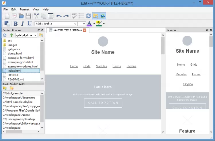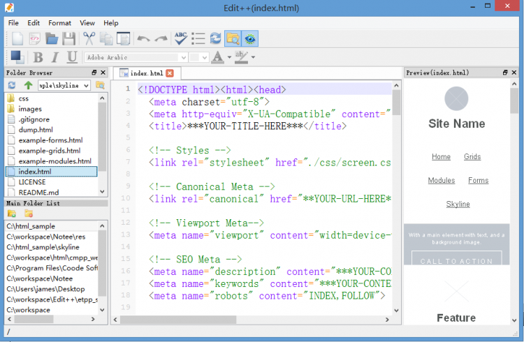 Edit++ предлагает вкладочный интерфейс. Он позволяет открывать и работать с несколькими документами параллельно. В редакторе есть встроенный файловый навигатор, через который удобно открывать файлы.