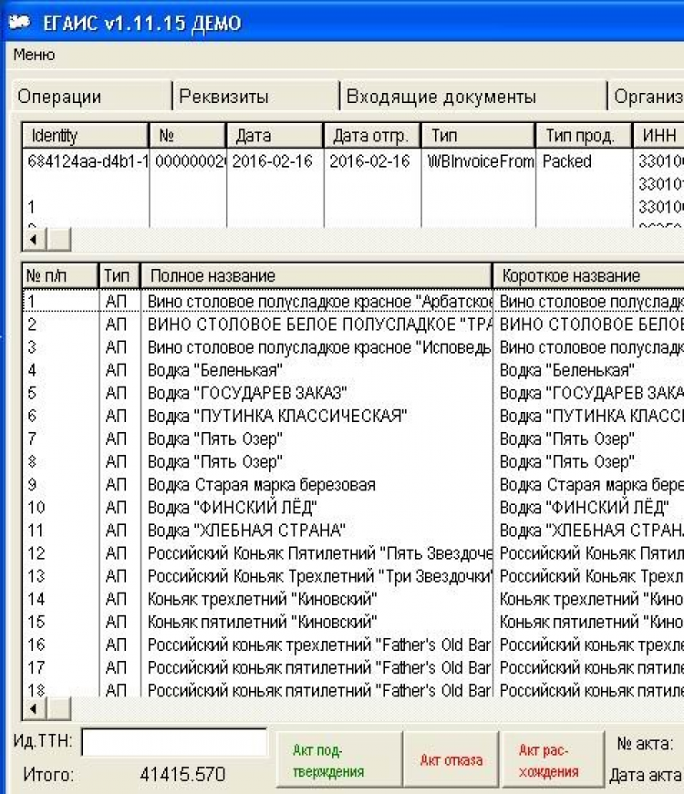 - Получение ТТН и отправка акта подтверждения, акта отказа. - c начала выполняем запрос на входящие документы (кнопка [Входящие]); - откроется список входящих документов (|Входящие документы|), если в списке нет строки "Входящая ТТН", то вам не отправили ТТН, иначе вы должны выбрать по наименованию документ "Входящая ТТН", двойной клик, после этого откроется ТТН (|ТТН|). - для подтверждения ТТН, [Справка Б], поле Идентификатор ТТН: будет заполнено данным из уведомления о регистрации движения, введите № акта, дату, [Акт подтверждения]; - для отказа от ТТН, .... ,[Акт отказа];