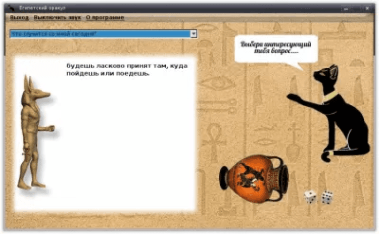Египетский оракул - это программа предназначена для любителей знать ответы на все вопросы. Египетский оракул создан на основе реальных Египетских гаданий. задавайте вопросы и получайте ответы.