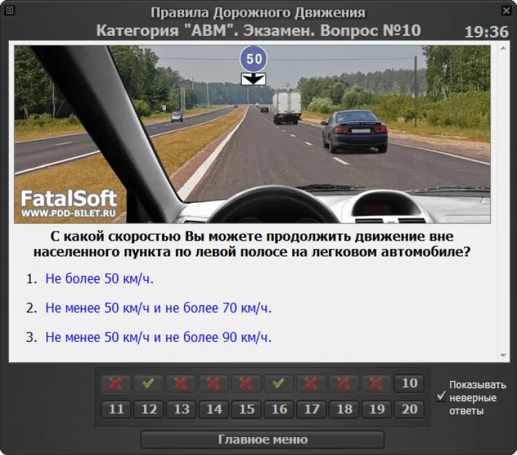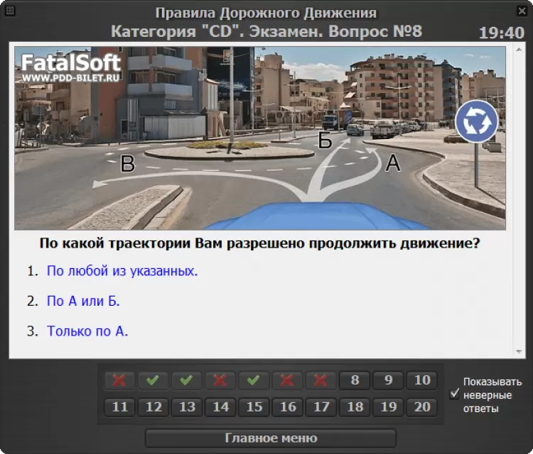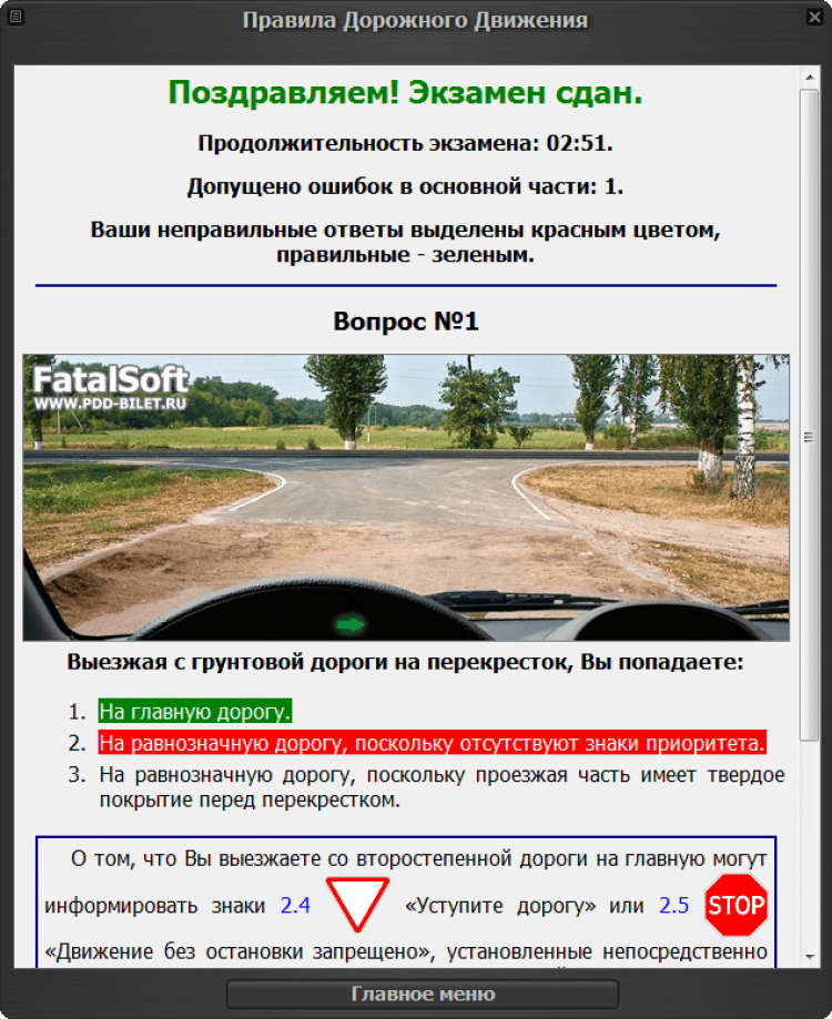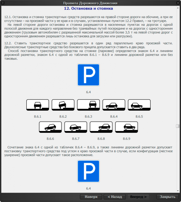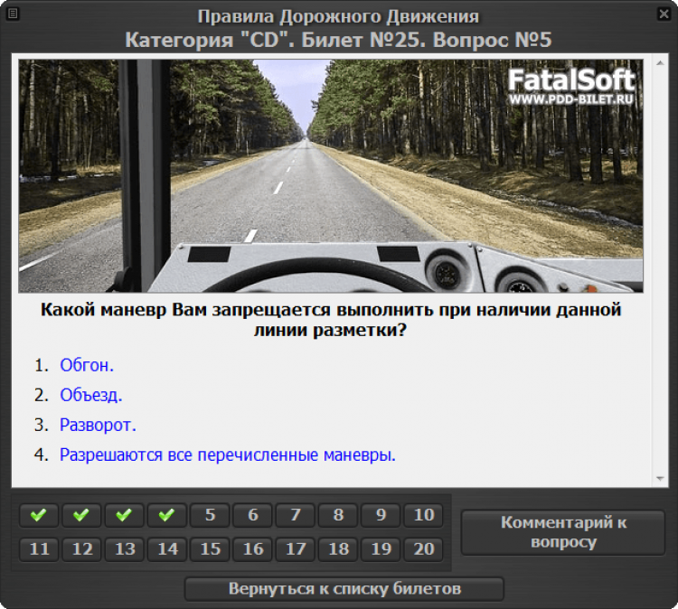 - Тренировочный режим. Экзаменационные вопросы можно изучать как по билетам (40 билетов по 20 вопросов), так и по темам. В данном режиме в случае неверного ответа программа сообщит об этом и предложит посмотреть комментарий к вопросу. Весьма удобным является отображение миниатюр дорожных знаков и разметки сразу же в окне комментария, а также быстрый переход к необходимому пункту ПДД.