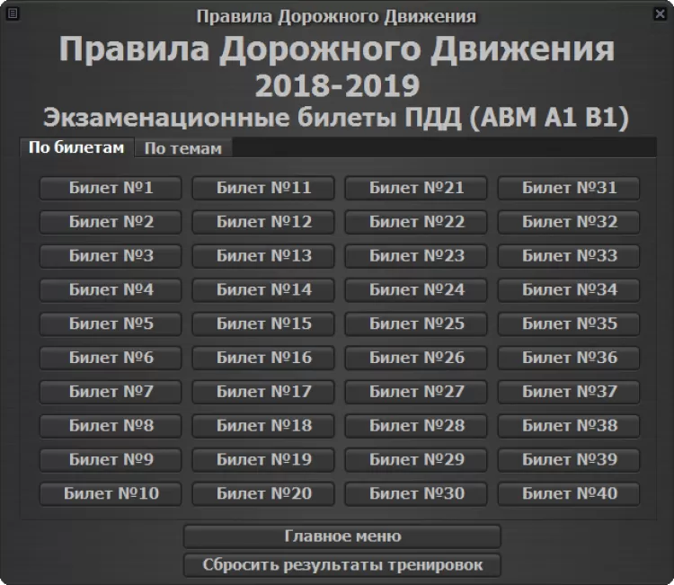 При разработке программы за основу были взяты официальные билеты ПДД 2018 ABM и CD.