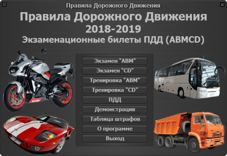 Экзаменационные билеты ПДД 2018 (ABMCD) - это программа с официальными билетами ПДД 2018 для быстрого обучения и сдачи теоретического экзамена ГИБДД на права категорий «ABM» и «CD», также подкатегорий «A1», «B1», «C1» и «D1».
