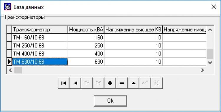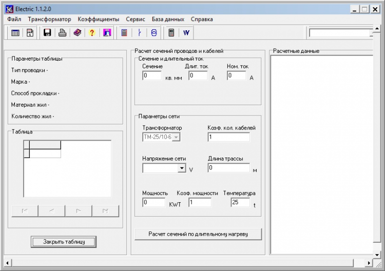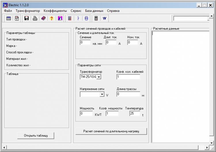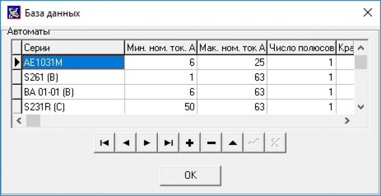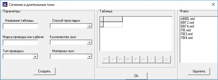 В базе данных можно создавать новые таблицы допустимых длительных токов для проводов и кабелей, заносить технические характеристики трансформаторов и автоматов.