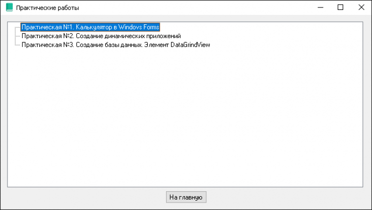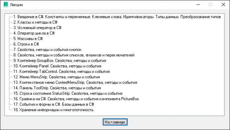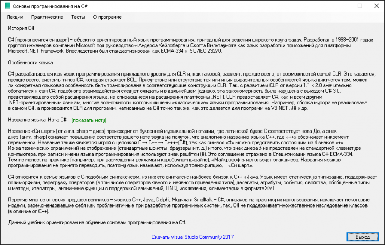 Электронный учебник "Основы программирования на C#" - это учебник, который ориентирован на обучение основам программирования на C#. Содержит 18 лекций, 3 практические работы: калькулятор, мини-игра и базы данных.