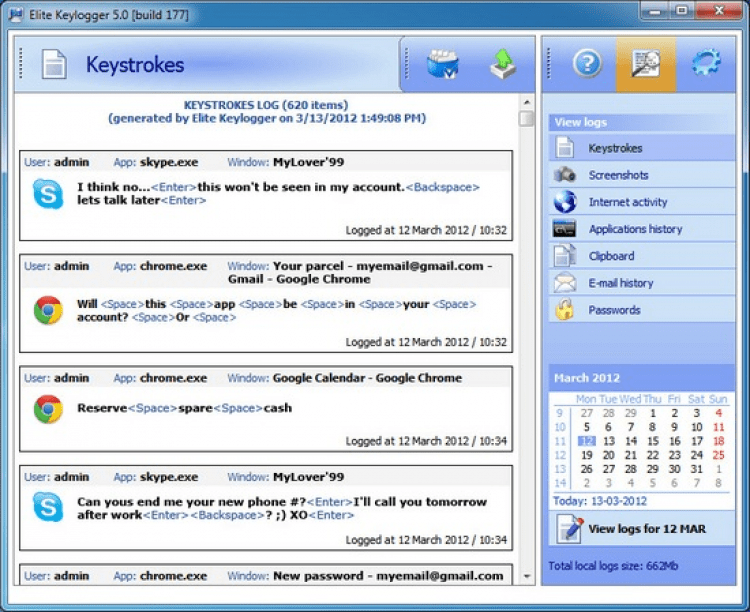 Elite Keylogger - это мощнейший кейлоггер для ведения тайного мониторинга всех типов пользовательской активности. В возможности кейлоггера входит отслеживание всех типов переписки от ICQ до e-mail, посещенных пользователями веб-сайтов, набранных паролей и используемых программ. Кроме этого Elite Keylogger генерирует снимки рабочего экрана пользователя, что гарантирует, что ни одно его действие не останется незамеченным.