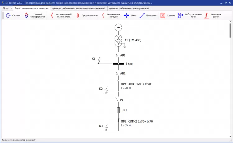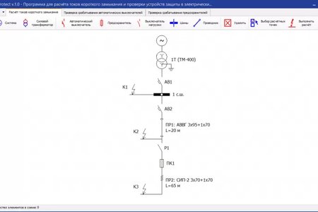 ElProtect - это программа для расчёта токов короткого замыкания в эл. сетях напряжением до 1000В, а так же для проверки срабатывания защитных аппаратов (автоматических выключателей и предохранителей).