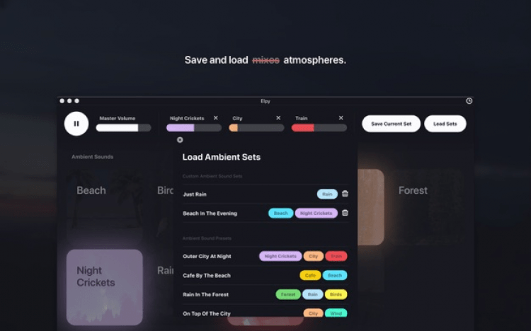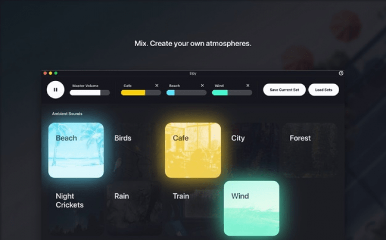 Elpy - это минималистичное, стильное приложение для macOS, которое позволяет создать рабочую или расслабляющую атмосферу с помощью комбинации фоновых звуков.