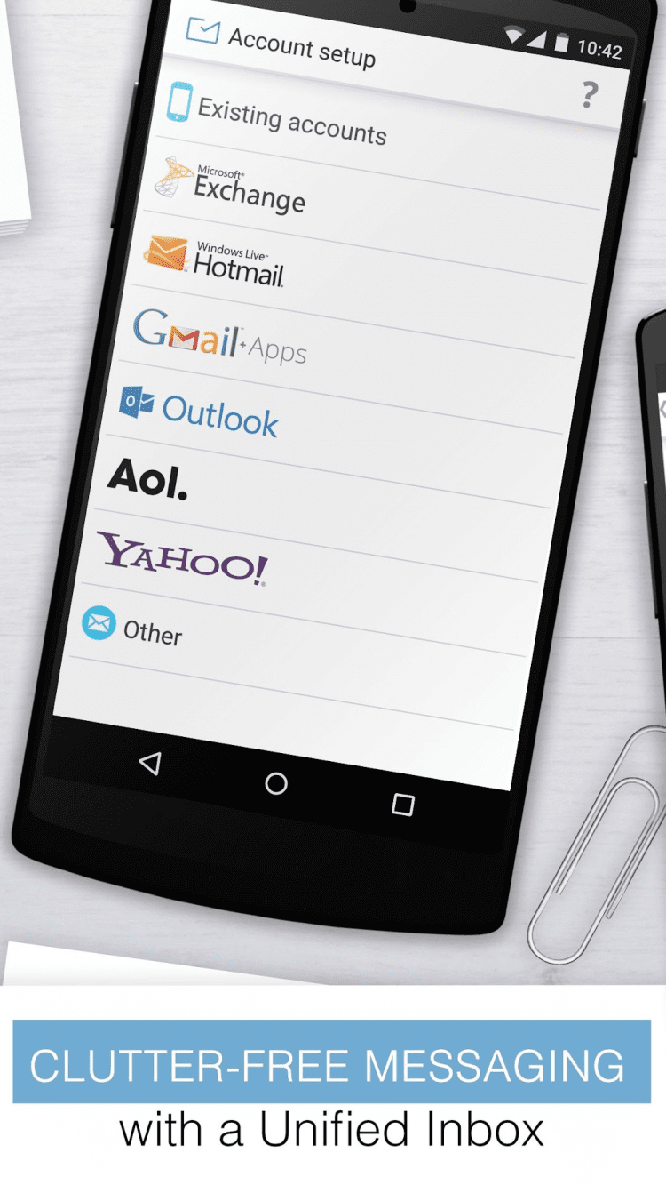 Email Exchange + by Mailwise Бесплатный почтовый клиент для Android-устройств, который обладает поддержкой таких почтовых серверов, как Exchange ActiveSync, Yahoo, AOL, Hotmail, Outlook, MSN, Gmail, GMX, а так же IMAP серверов. С помощью Email Client for Exchange +, вы можете получить доступ к нескольким серверам одновременно, управлять списками писем при помощи свайпов, сортировать входящие письма по спискам непрочитанных и отмеченных звездочкой, вставлять информацию из списка контактов всего в один клик, а так же многое другое.