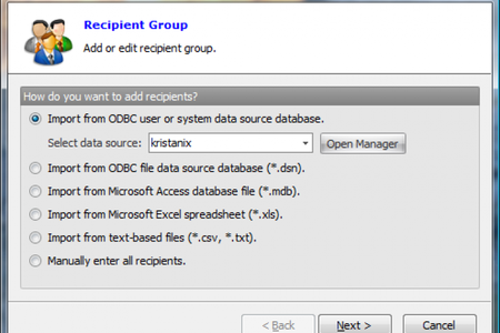 - импорт списка получателей из БД Oracle, SQL Server, Access и MySQL;