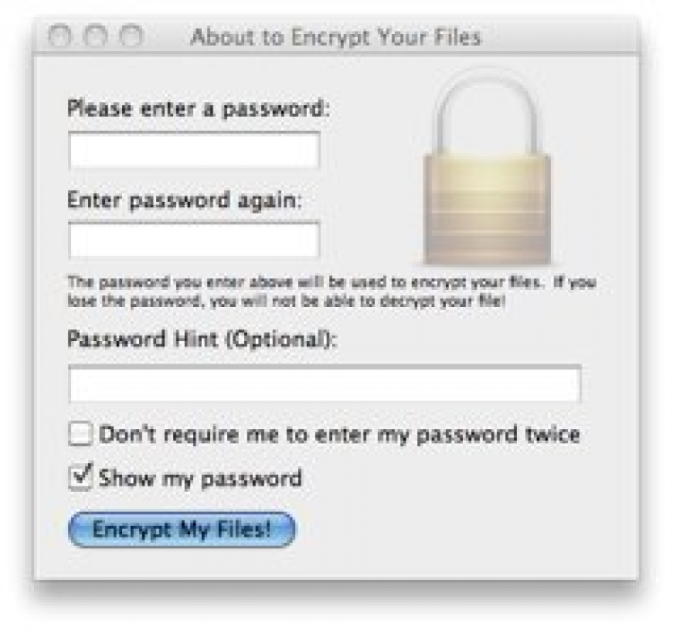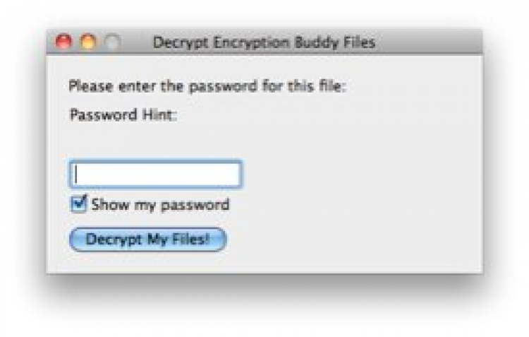 Encryption Buddy Утилита, которая поможет защитить паролем абсолютно любой файл. Encryption Buddy обаладет простым и понятным интерфейсом. Просто перетащите файл в окно программы, задайте пароль и нажмите "Encrypt My Files!". Точно так же происходить и дешифровка файла. Поэтому если хотите передать файл другу, убедитесь, что у него установлен Encryption Buddy.