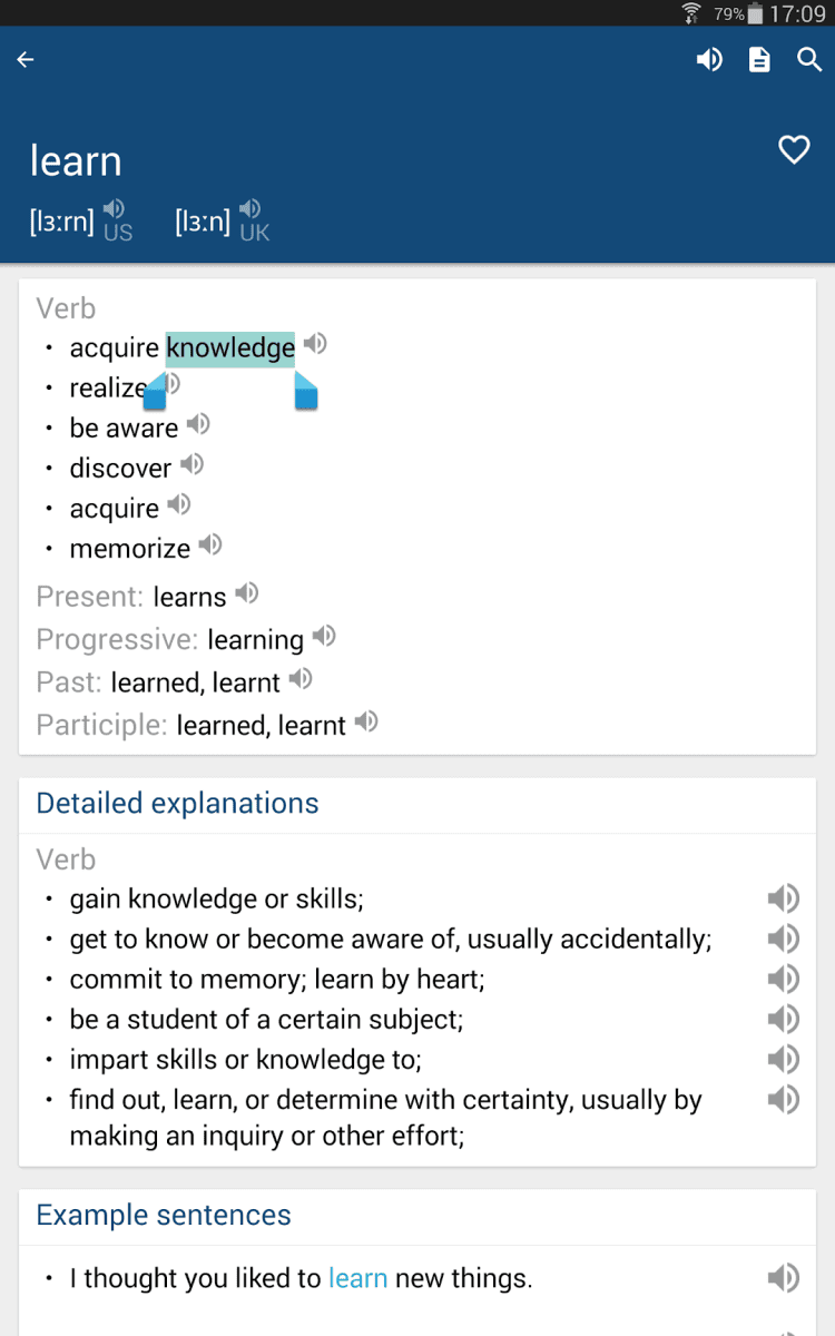 English Dictionary для Android позволяет чувствовать уверенность в чужой стране при общении с любым собеседником. Утилита позволяет заглянуть в словарь, узнать определение нужного слова. Правда, придётся подтянуть базовые знания: словарь написан на английском языке.