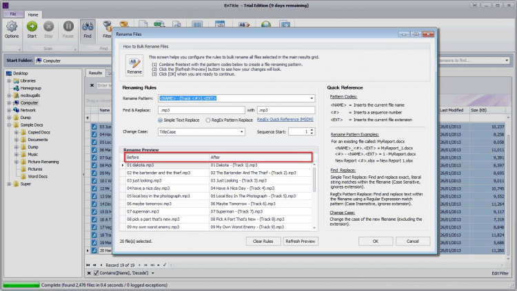 EnTitle позволяет полностью или частично изменить имена файлов, добавить порядковый номер, изменить регистр букв и пр. Все изменения можно увидеть сразу, до их применения. Программа поддерживает большинство распространенных форматов.