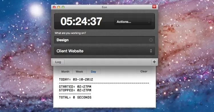 Eon Программа для подсчета времени, затраченного на выполнение определенной задачи. Eon отмечает время начала и оконочания работы, и выводит затраченное время в секундах. Если пользователь во время работы отошел от компьютера и забыл остановить таймер, Eon зафиксирует время простоя и предложит вычесть его из конечного результата.