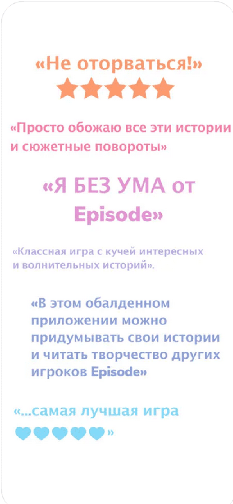 В Episode вы найдете сотни тысяч историй на любой вкус. Чтобы принять в них участие, необходимо предварительно создать персонажа. Для этого вам будет доступен удобный конструктор, при помощи которого можно настроить внешний вид героя до мельчайших деталей. Затем, нарядите персонажа и получите доступ к огромной коллекции интерактивных историй, где каждое принятое вами решение повлияет не только на развитие отношений между героями, но и на итог повествования. А одной из самых приятных особенностей игры является возможность создания собственных историй.