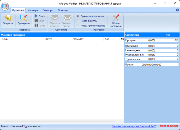 ePochta Verifier - это программа поможет вам избежать отправки сообщений на несуществующие электронные адреса. Список адресатов может быть импортирован в эту программу из других приложений ePochta, текстового файла или буфера обмена Windows. После этого вам останется лишь нажать на кнопку «Проверить» для получения результата. Программа использует три метода проверки электронных адресов на правильность, что позволяет производить эти операции максимально быстро и качественно. Все процедуры производятся в многопоточном режиме и используют все возможности интернет-канала.