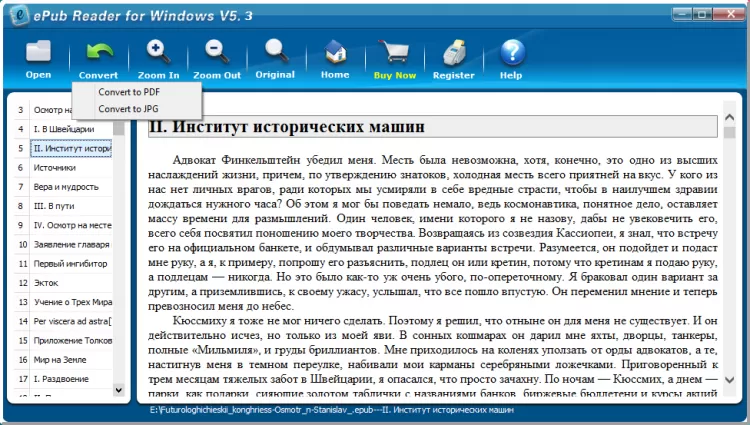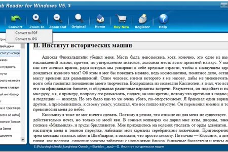 Помимо этого, Epub Reader позволяет конвертировать электронные книги из формата epub в PDF документы или JPG изображения. Программа без проблем понимает большинство кодировок. В ней также есть функция печати с предварительным просмотром.