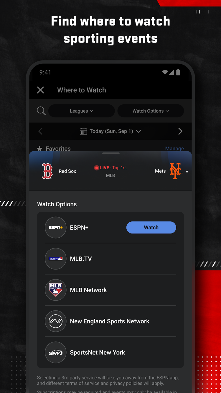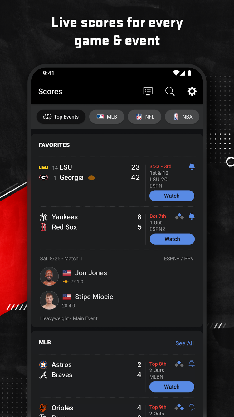 Повысьте свой спортивный опыт с приложением ESPN для Android. Независимо от того, являетесь ли вы поклонником футбола, баскетбола или любого другого вида спорта, ESPN предоставит вам последние новости, результаты матчей в реальном времени, основные моменты и экспертный анализ. Погрузитесь в мир спорта с персонализированными обновлениями, прямой трансляцией основных событий и доступом по запросу к многочисленному эксклюзивному контенту. Благодаря интуитивно понятной навигации и элегантному, удобному дизайну приложение ESPN гарантирует, что вы никогда не пропустите ни одного момента действия, где бы вы ни находились.