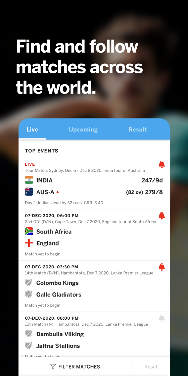 ESPNcricinfo — официальное мобильное приложение вебсайта, посвященного крикету. Здесь вы найдете последние новости, результаты матчей с обновлениями в реальном времени и многое другое.