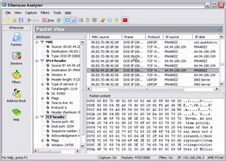Реконструкция сессий TCP/IP позволяет увидеть данные в том виде, в котором они были посланы, например можно увидеть письмо или пароль к сайту. Etherscan Analyzer необходим сетевым администратором, специалистам по безопасности, программистом Интернет приложений и все тем, кто хочет иметь полную картину сетевых пакетов проходящих через компьютер или локальную сеть.