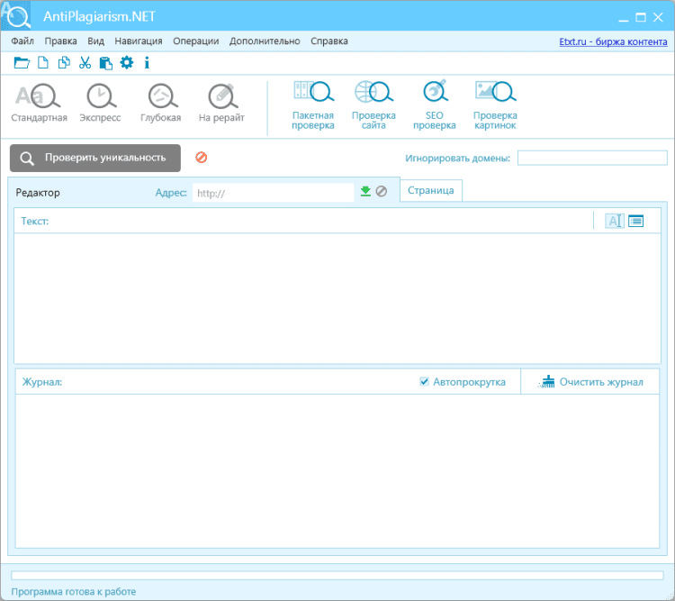 eTXT Антиплагиат - это полезная программа, с помощью которой вы сможете определить уникальность написанного вами текста. Она поможет сравнить сравнить ваш текст, оценить его уникальность и найти совпадения на других сайтах. Она поможет определить уникальность ваших текстов и найти совпадения в сети. Программа проверяет текст и отмечает разными цветами уникальные и не уникальные фрагменты. Цвет изменяется в зависимости от количества совпадений. Уникальность текста определяется в процентах.