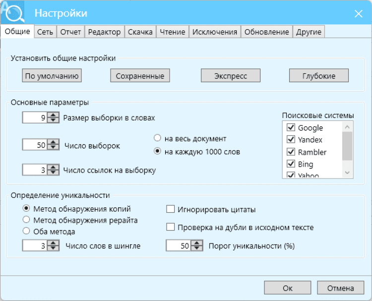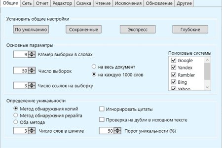 По результатам проверки eTXT Антиплагиат создает подробный отчет. При создании отчета можно изменять параметры поиска, например число выборок, количество в шингле и многое другое. Кроме того, программа позволяет выполнять проверку файлов из папки в пакетном режиме и сортировать их по уникальности.Она выполняет поиск совпадений, используя сервисы Яндекс, Google, Bing, Mail, Nigma, Qip, Poisk и Genon.