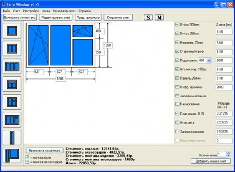Euro Window - это программа для расчета стоимости оконных конструкций и аксессуаров, и последующего составления счета. Программа ориентирована на фирмы, занимающиеся поставкой и установкой евроокон. Euro Window позволяет резко сократить время расчета заказа и заключения договора.