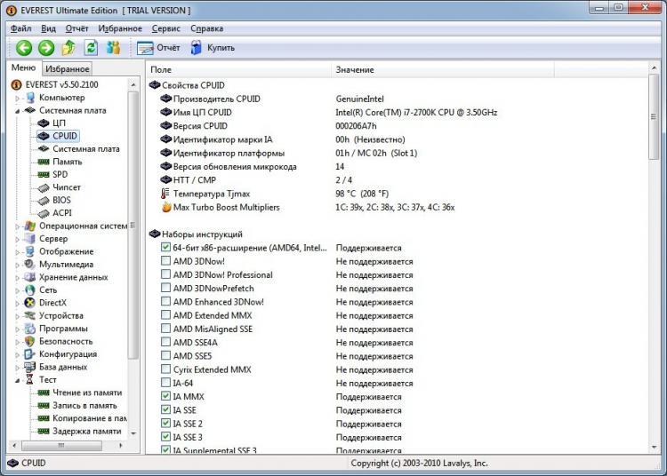 EVEREST Ultimate Edition для Windows предоставляет подробную информацию, необходимую пользователям. В число оцениваемых факторов входит тактовая частота, размер кэша, изготовитель, напряжение питания, объем памяти, режимы работы и другие данные, отвечающие за качество работы оборудования. Для оценки производительности процессора прибегают к различным тестам, среди которых: