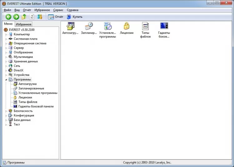 Кроме информации об аппаратной части вашего ПК, EVEREST Ultimate Edition отображает информацию по программной части, в том числе об установленных программах, драйверах, запущенных процессах, программах в списке автозапуска, конфигурации операционной системы.