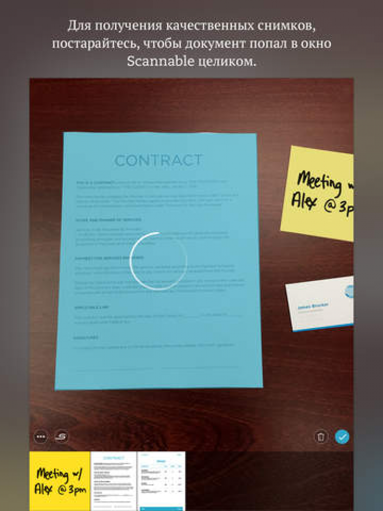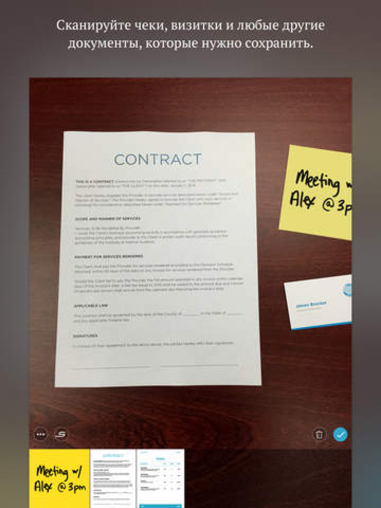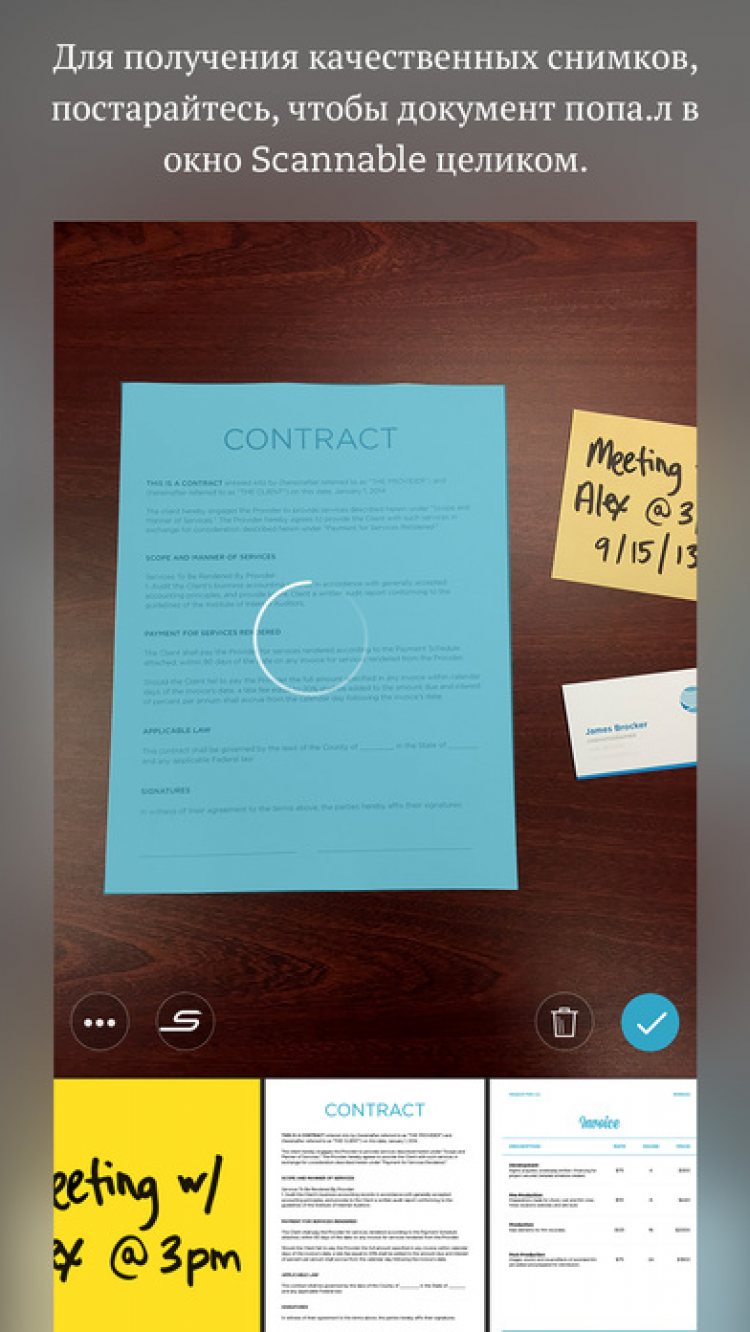Приложение Evernote Scannable максимально облегчит перенос документов в электронный вид. Всё, что для этого потребуется, это направить камеру на нужный документ, визитную карту, квитанцию, контракт, либо любой другой печатный документ, а затем сделать снимок.