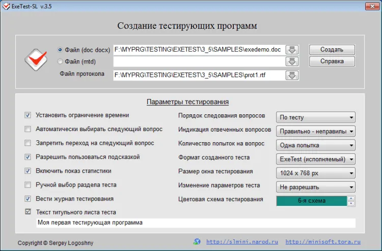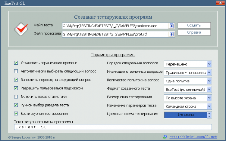 ExeTest-SL - это программа предназначена для создания компактных исполняемых тестов (т.е. независимо функционирующих тестирующих программ), готовых для проведения индивидуального тестового контроля теоретических знаний по различным направлениям. Для создания исходного файла теста в качестве редактора теста используется текстовый редактор MS Word, что позволяет использовать в вопросах дополнительные объекты и форматирование шрифта.