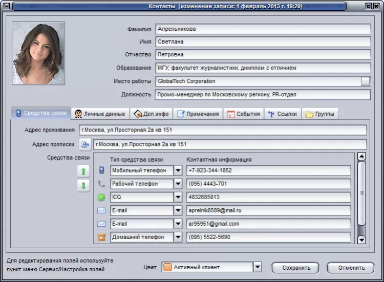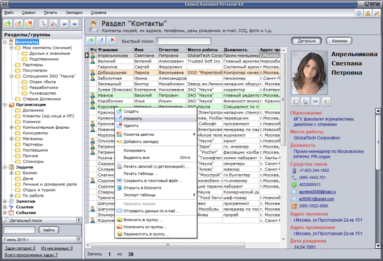 - ведение базы клиентов, друзей, знакомых (контакты, фото, адреса, телефоны и т.д.);
