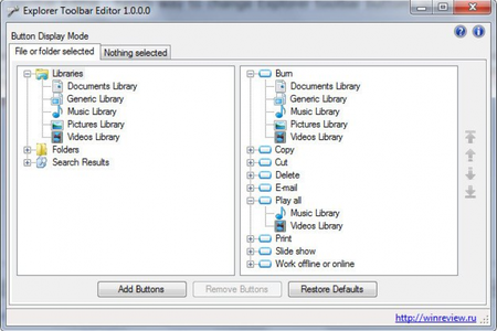 Explorer Toolbar Editor - это программа, которая позволит добавлять и удалять кнопки с панели инструментов Проводника Windows 7. Более того, для разных папок можно задать свой набор кнопок.