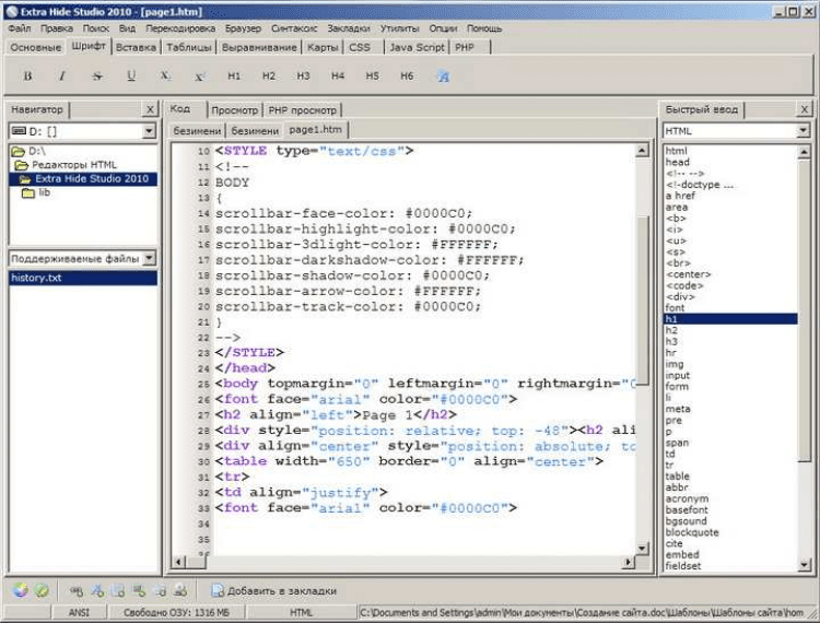 Закладки можно изменить Избранное на 10 файлов - быстрое открытие важных документов 7 утилит - Подборка HEX цвета, мастер ссылок, мастер создания таблиц, FTP клиент, отправка на e-mail, Вставка картинки, Адресная книга Фоновая музыка Множество настроек и удобное их расположение позволит настроить Extra Hide по Вашему вкусу Функция защиты глаз успокоит Ваши глаза и снизит риск падения зрения Быстрая вставка тегов Навигатор файлов - боковая панель, позволяющая быстро открыть необходимый файл на диске, не вызывая диалоговое окно открытия файлов .