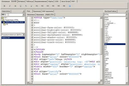 Extra Hide - это не визуальный веб редактор. Основные возможности программы: Подсветка синтаксиса популярных языков программирования: HTML, C++, Pascal (Delphi), Basic, CSS, Java Script, PHP, VB Script, XML Имеются 10 шаблонов готовых веб страниц, эти же шаблоны можно изменить по своему усмотрению История 5 последних открытых файлов Встроенный браузер для просмотра страницы прямо в редакторе Печать с заданием параметров печати, и стандартные меню Правка Поиск и замена с сохранением параметров поиска Полноэкранный режим позволит убрать все лишние панели для удобства редактирования Перекодировка из КОИ-8 в Windows и обратно, а также из Dos в Windows 3 закладки браузера для быстрого посещения важных сайтов.