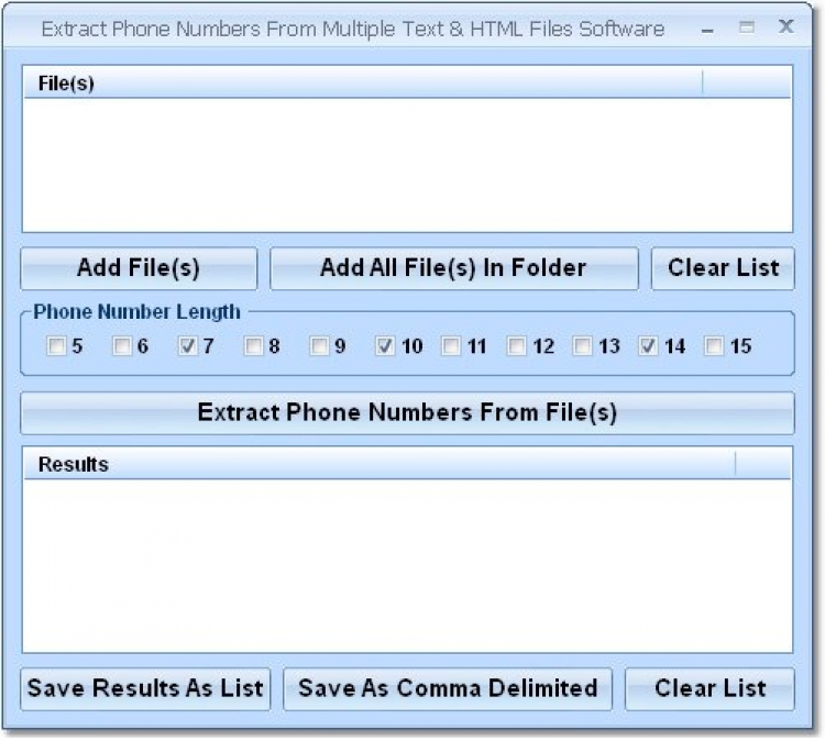 Extract Phone Numbers From Multiple Text & HTML Files - это небольшая утилита, с помощью которой можно извлекать телефонные номера из текстовых и HTML файлов. Перед извлечением необходимо указать количество цифр в номере. Дублирующиеся номера автоматически удаляются из результатов.