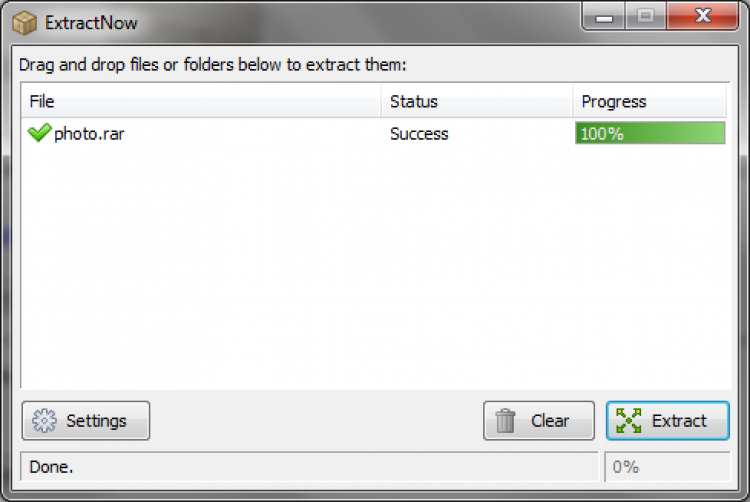 ExtractNow Portable это компактная, простая и удобная утилита, позволяющая быстро извлекать файлы из архивов. С ее помощью можно распаковывать одновременно несколько архивов всего одним нажатием.