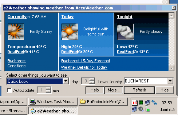 Она показывает фактическую температуру воздуха и температуру "по ощущениям" на текущий день, а также на ближайшие несколько дней в привычных для вас единицах измерения. eZWeather берет информацию о погоде с сайта AccuWeather.com и регулярно обновляет ее, обеспечивая вас актуальным прогнозом. Вы можете добавить несколько городов и следить за погодой в них не открывая браузера. Вы также можете настроить эту программу на отображение текущей температуры воздуха в системном трее, просматривать график изменения температуры, и многое другое.