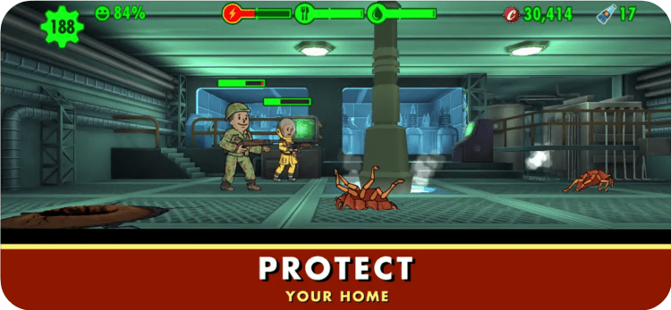 Назначьте охранников на входе, чтобы встречать непрошеных гостей и оказывать им достойный прием. На убежище могут напасть рейдеры и даже когти смерти, так что позаботьтесь о хорошем оружии и защите для своих жителей. Также вам предстоит бороться с пожарами и нашествиями рад-тараканов или кротокрысов.