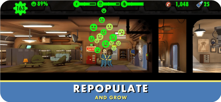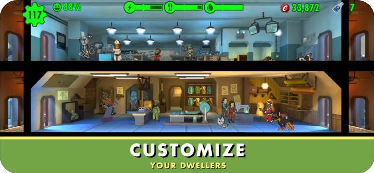 В Fallout Shelter вам также предстоит следить за счастьем жителей Убежища. Подбирайте им идеальную работу, а также выдавайте им костюмы, улучшающие навыки работы в той или иной сфере.