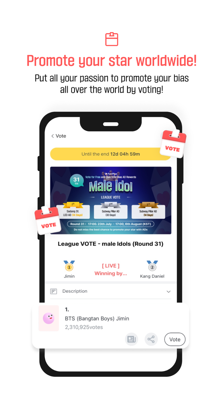 Вы ярый поклонник K-Pop? Тогда вам определенно понравится приложение FanPlus. Это мобильное программное обеспечение было разработано, чтобы вывести ваш фандом на новый уровень. Приложение связывает вас с вашей любимой знаменитостью. Регистрируясь в программе, все пользователи получают билеты для голосования и могут использовать их для поддержки своих любимых айдолов. Программа время от времени запускает новые голосования, по результатам которого победитель получает бесплатную рекламу в той или иной части мира. Продолжительность и место размещения рекламы зависят от конкретного голосования. Важно, что поддержка кумира абсолютно бесплатна для пользователей. Чем больше вы голосуете, тем выше ваши шансы получить специальные сертификаты и значки, которые затем появляются в вашей учетной записи. Таким образом, вы сможете показать другим членам сообщества, насколько вы преданный фанат.