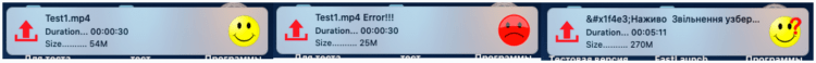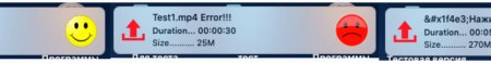 Жёлтый смайлик обозначает успешную передачу, а красный ошибку. С вопросительным знаком - программа не смогла определить размер, это возможно из за символов # ? и т.д.При первом запуске программы создаются папки /Desktop/FastLaunch/Results, в папке Results находятся видеофайлы в работе, после выгрузки на сервер видеофайлы отправляются в папку FastLaunch.