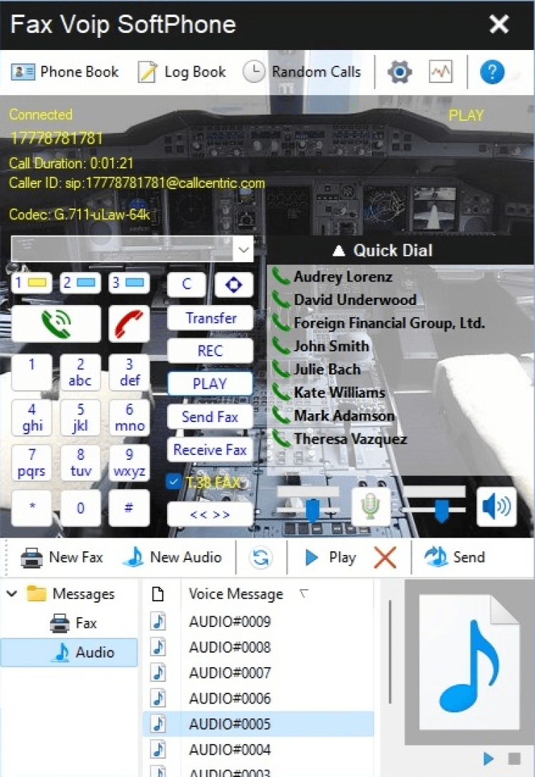 Весь функционал доступен в рамках единственного приложения с использованием любого провайдера IP телефонии (VoIP). Мелодия на удержании. Перевод вызова. Переадресация вызова – абсолютная, по занято, по недоступности. Audio и Fax панель позволяет быстро отправить заранее подготовленные факсы и аудио сообщения. С помощью Log Book вы можете легко просматривать историю вызовов, просматривать полученные и отправленные факсы, прослушивать записи разговоров и отправленные аудио сообщения. Телефонная книга является удобным местом для хранения информации о ваших контактах.