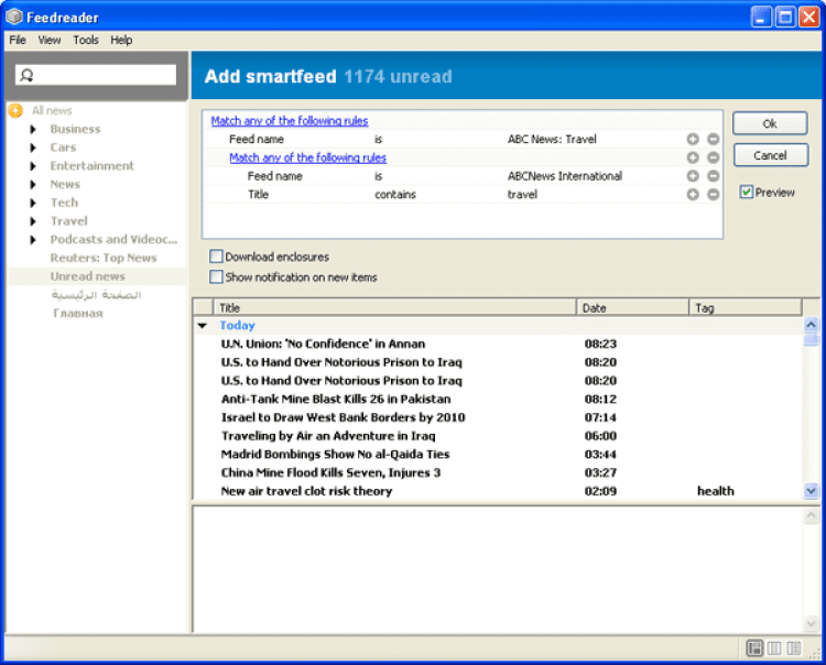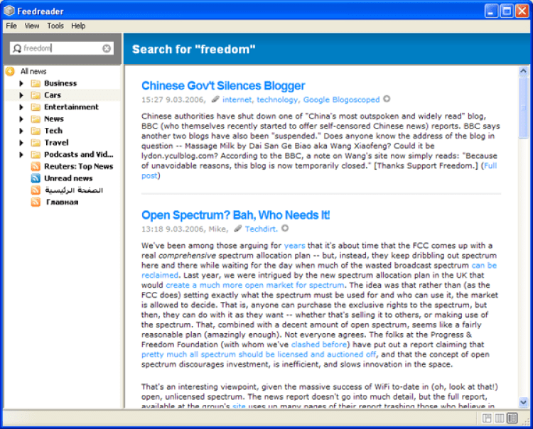 Feedreader обеспечивает постоянные поток самых свежих новостей, автоматически обновляя ленты. Этот агрегатор с легкостью справляется с большим количеством лент: их можно раскидывать по категориям, группировать по источнику, дате или тегу, а так же объединять несколько RSS-лент в одну. Программа предлагает мощный фильтр, с помощью которого можно оставить в ленте только интересующие новости. Она также позволяет создать "умную" ленту, которая будет собирать только те новости, которые имеют отношение к ключевым словам или фразам.