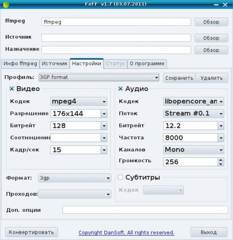 FeFF - это простой и удобный конвертер видео, Qt графическая оболочка (GUI) к FFmpeg - утилите командной строки, позволяющей записывать, конвертировать и передавать цифровое аудио и видео в различных форматах. Поддерживаются все форматы, поддерживаемые FFmpeg.