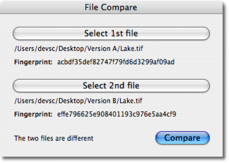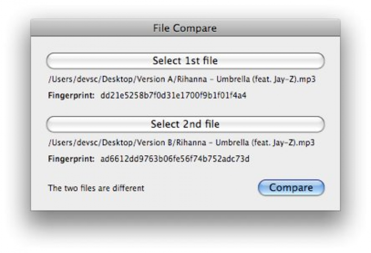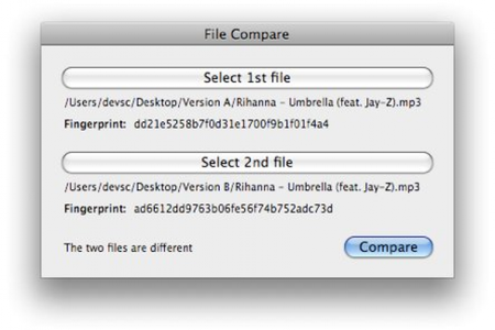 File Compare Маленькая программка для сравнения контрольных сумм двух файлов. Позволяет сравнивать графические файлы, аудио и другие файлы.
