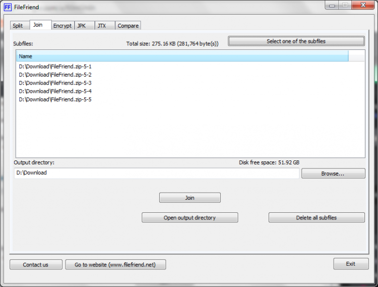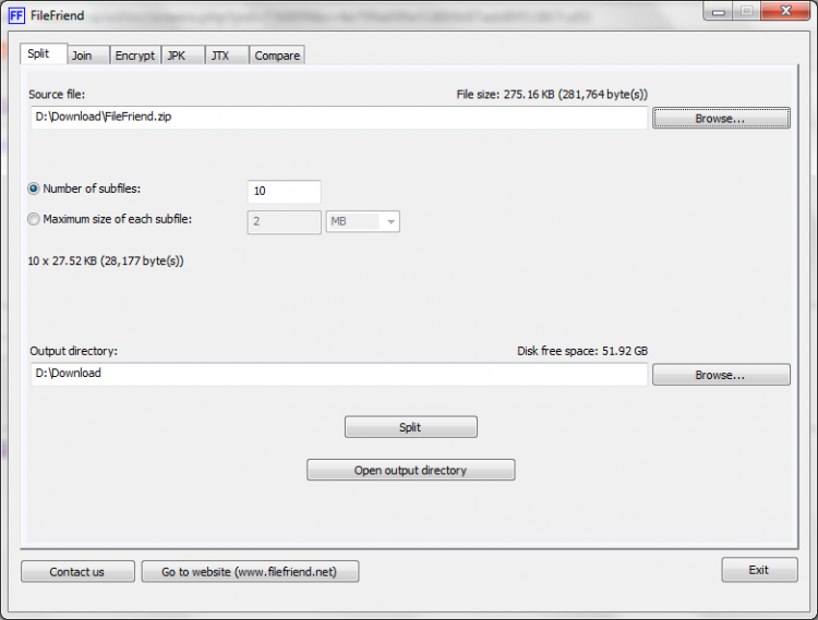 FileFriend простая утилита, для манипуляции с файлами. Позволяет разбить файл на части, которые затем может склеить обратно, а также защищать файлы и папки паролем и не только. Каждая функция программы имеет собственную вкладку в главном окне. Настроек немного, поэтому разобраться в них несложно.