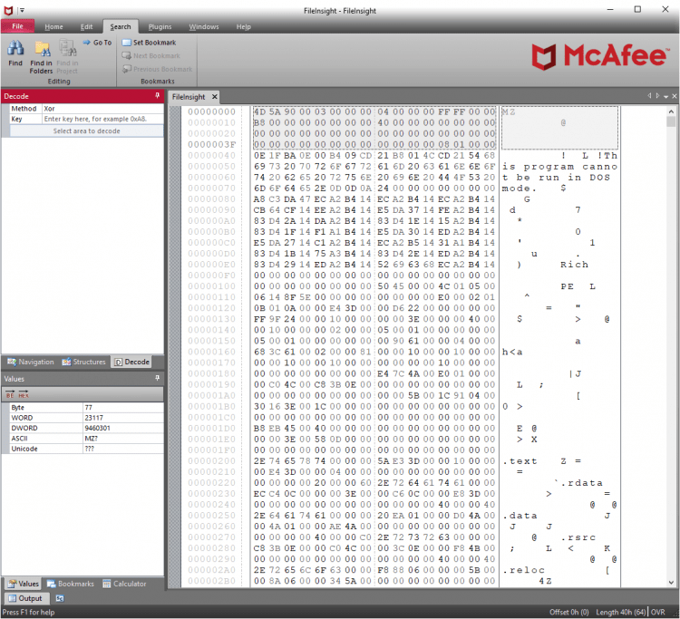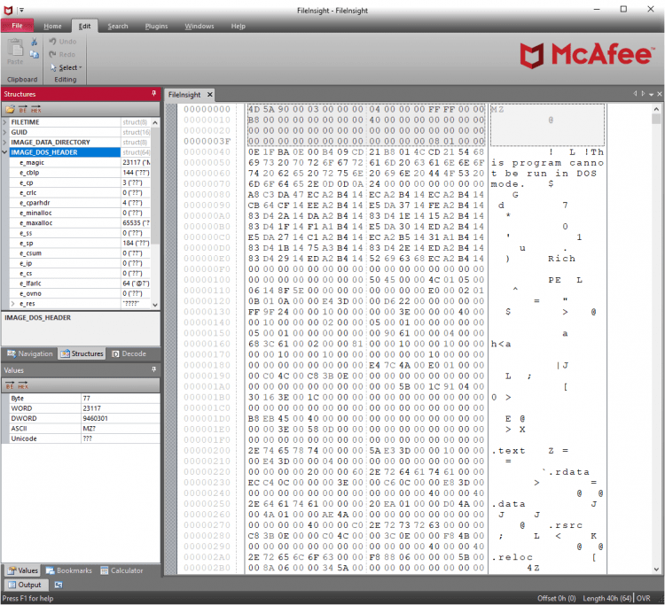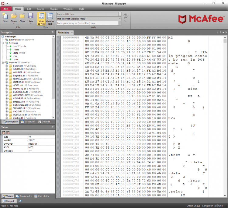 FileInsight — программа, разработанная специально для специалистов по безопасности, и призванная помочь в анализе файлов. С ее помощью можно увидеть внутреннюю структуру исполняемого файла, проанализировать его, найти уязвимости и определить метод распространения вредоносного кода.