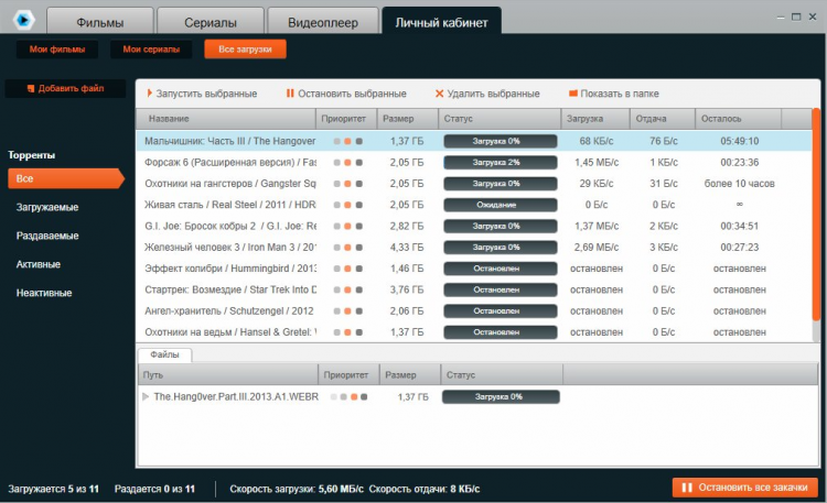- Личный кабинет позволяет управлять своими закачками и хранит информацию об уже загруженных файлах.