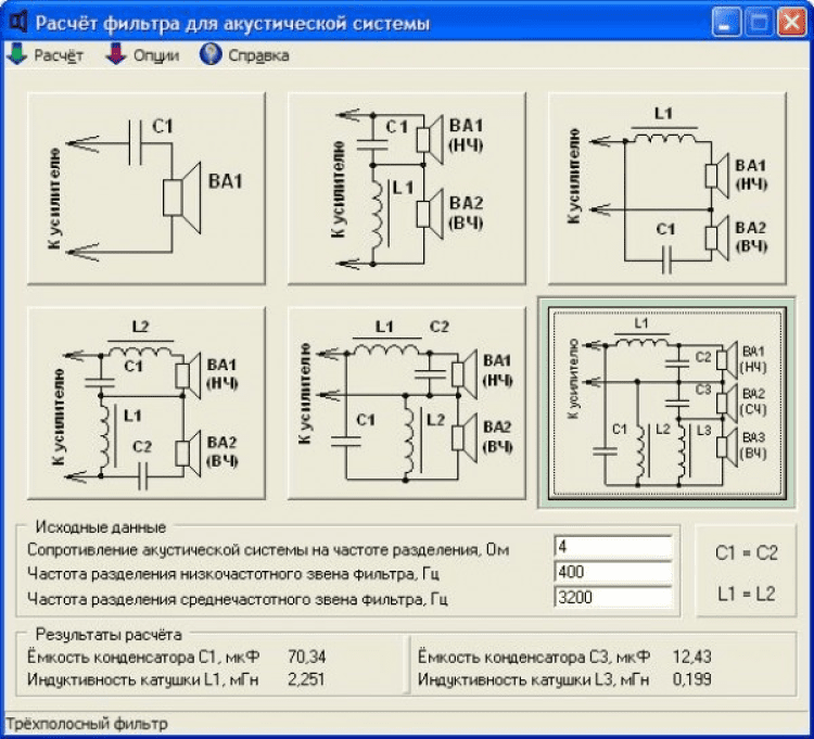 Filter for acoustic system - это программа предназначена для расчётов 6 вариантов кроссоверов - пассивных фильтров акустических систем. В справке программы приведены рекомендации по расчёту кроссоверов, имеются расчётные формулы. Количество головок в колонке - одна, две или три. Относительно предыдущей версии программа полностью «с нуля» переписана.